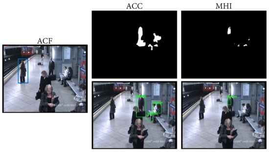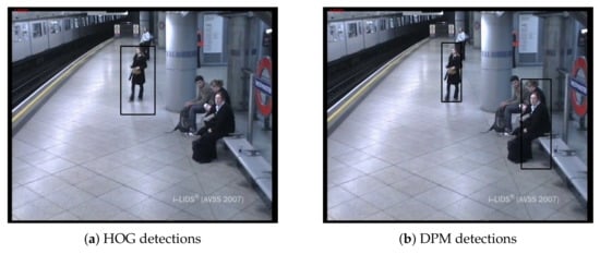 Depending on the final application, static objects of interest, i.e., candidates of interest, may vary. There are works only focused on detecting abandoned luggage [,]; others are geared towards illegally-parked vehicle detection [,]; and others adopt a comprehensive approach [,]. Since detecting abandoned objects, in general, is the goal of interest, one can make the assumption that whatever is not a person can be considered as an object. Following this strategy, this distinction problem between people and objects can be solved simply by applying a people detector. Figure 5 illustrates an example of people detection results over two sample frames.