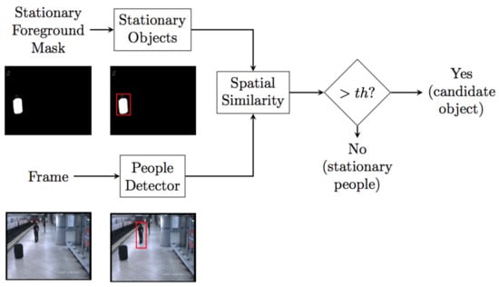 Block diagram of the candidate generation module. Stationary objects and people detection blobs are independently extracted and then spatially compared. If a stationary object overlaps with people detection, it is considered as a static person, otherwise the object is a potential abandoned object candidate.