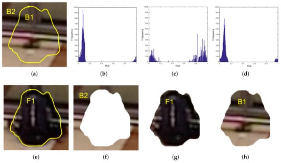 Example of Pixel Color Contrast algorithm operation. Subfigure (a) shows initial frame and (e) depicts an abandoned bag in a posterior frame. PCC computes Hue histograms, (b–d), from B2 (f) , F1 (g) and B1 (h), respectively. Histogram comparisons (b,c) and (c,d) are made and final abandoned decision is taken from the results. Since (b) is more similar to (d) than to (c), this means (e) represents an abandoned object.