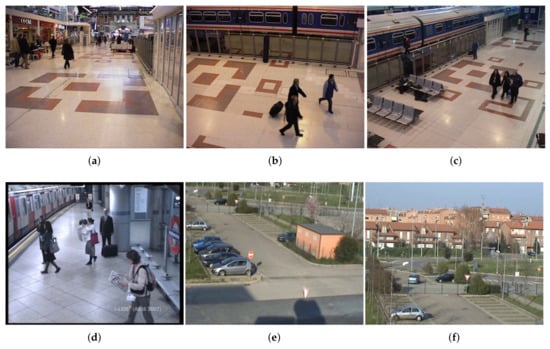 Sample frames from: (a) PETS 2006 camera 1, (b) PETS 2006 camera 3, (c) PETS 2006 camera 4, (d) AVSS AB 2007, (e) VISOR View 1, and (f) VISOR View 2.