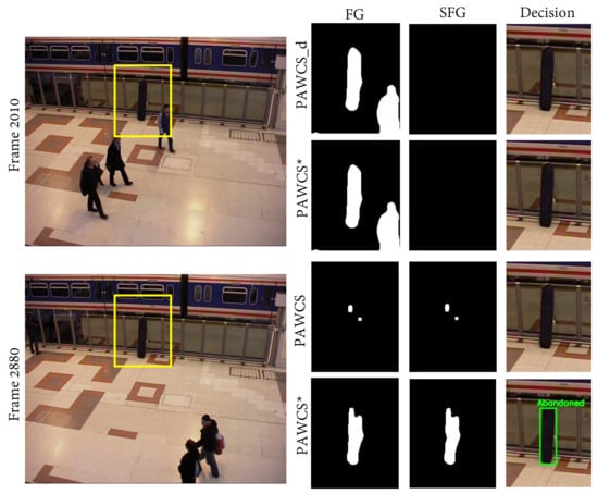 AOD state-of-the-art systems [,,,] widely employ Mixture of Gaussian (MoG) [] and Kernel Density Estimation (KDE) [] approaches for BS. This choice might not seem optimal, as recent BS approaches clearly outperform MoG and KDE according to recent benchmarks [] such as the Pixel-based Adaptive Word Consensus Segmenter (PAWCS) approach []. However, such improvement is mostly achieved by removing false positives at the cost of increasing false negatives. Recent approaches increase the update rates of the background models [], so scene changes (e.g., illumination and shadows) are quickly incorporated into the model. Figure 3 shows examples of different update rates and the effect on the foreground segmentation masks for abandoned objects. Other approaches propose complex strategies requiring many parameters [], which are difficult to adjust for different scenarios of AOD. These strategies increase AOD challenges and might lead to missing AOD events. By changing the rate of the update scheme, stationary objects may be quickly incorporated into the background models, thus becoming false negatives. Therefore, BS approaches exhibit a trade-off between adaptability of models to changes and the capability of detecting stationary foreground. Furthermore, better algorithms often require additional computations, and therefore, lower frame-rates can be achieved. Hence, unlike initially thought, simple algorithms might be a good choice as they are fast and their limitations may be palliated by the remaining AOD stages, which involve the removal of false positives using temporal information and image properties. We analyze this apparent contradiction in the experimental work by analyzing the effect of BS approaches in the AOD performance (see Section 6) and demonstrating that classical approaches [,] behave in a similar way to recent top-performing BS approaches in this context, but requiring a significantly lower computational cost.