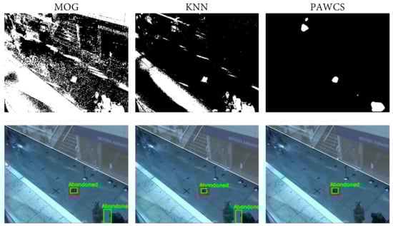 For the foreground segmentation stage, we have considered MoG [] as the baseline, since it is widely used across the AOD literature, and we have also included alternative approaches not employed within the context of AOD systems, such as KNN and PAWCS. K-nearest neighbors background subtraction (KNN) [] was included because it is a simple and fast improved version of MoG. The Pixel-based Adaptive Word Consensus Segmenter (PAWCS) [] was selected as the top-performing proposal according to the evaluations of CDNet2012 and 2014 [].