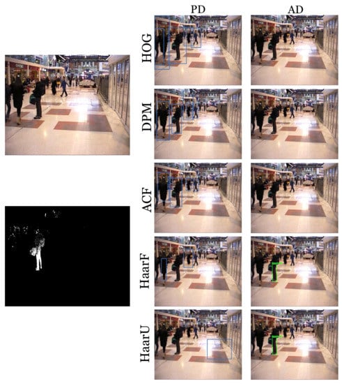 For the candidate generation stage, we apply a people detector to generate potential candidate objects from the static foreground regions. Therefore, we term this stage as People Detector (PD) in the rest of the paper. We include traditional hand-crafted feature-based approaches already employed in AOD systems such as the Histogram of Oriented Gradients (HOG) [], the Haar-like feature classifier for full (HaarF) and upper body parts (HaarU) [] and the Deformable Part Models (DPM) []. Moreover, we have also integrated the recent Aggregated Channel Feature (ACF) [] detector, although it has not been used in this scope, because it has been shown that it outperforms the previously- cited ones []. In addition, we have considered as well two neural network-based object/pedestrian detectors, Faster R-CNN [] and YOLOv2 [].