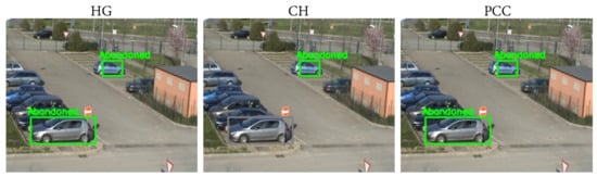 State-of-the-art proposals for abandoned object detection employ different techniques for candidates’ classification. Color-based approaches were used in the systems proposed in [,]; however, hybrid approaches are the most widespread. In [], the authors proposed a complete abandoned object detection system using a fusion hybrid approach to classify potential candidates. Another innovative method also combining edge and color information, called Pixel Color Contrast (PCC), was proposed in [] for this aim. Figure 8 illustrates an example of the color-based approach proposed in [].