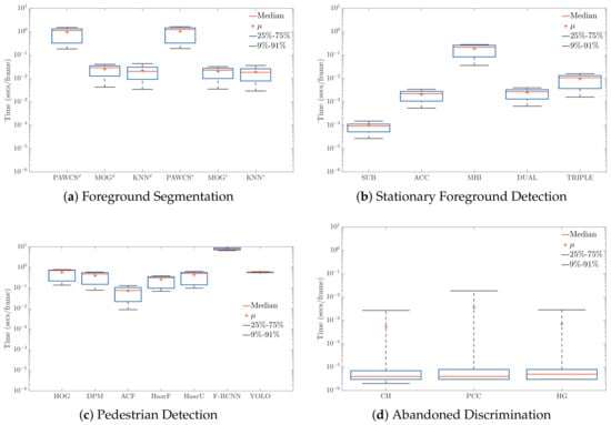 Table 1 compares recent surveys for automated video-surveillance. This paper complements other surveys for AOD systems regarding moving object detection [,,], stationary object detection [,], people detection [,], activity recognition [,], abnormal behavior recognition [,], and multi-camera analysis [,]. Most surveys are focused on providing a deep coverage for moving object detection and behavior recognition. However, these surveys superficially deal with events such as abandoned object detection or illegally-parked vehicles. Moreover, existing datasets are frequently analyzed, but experimental comparisons are rarely provided, which limits the conclusions that can be drawn from such analysis. Albeit that our proposal may share some similarities with some surveys discussing stationary foreground detection [,] (a key stage for AOD systems), this paper analyzes all stages in the processing pipeline of AOD systems including critical reviews of state-of-the-art approaches. We improve [] by proposing a new taxonomy for stationary foreground detection based on concepts that do not overlap across categories, as in [] (e.g., persistence is shared by several categories). Recently, [] surveyed Stationary Foreground Detection (SFD), organizing the literature into seven categories (tracking, persistence, dual background, classifiers, Gaussian stability, combinations, and others) and denoting robustness or not against five properties (occlusions, long-term, stationary pedestrians, removed or stolen object, and ghost regions). This classification, though exhaustive, defines categories with concepts that are not unique to each category. For instance, persistence is used to detect static objects that are later verified via tracking or classifiers, and dual background models are based on persistence to determine stationarity. Therefore, we prefer to adopt a different perspective that focuses on reviewing the ideas behind the algorithms for SFD, providing a panoramic view of them and their evolution in time rather than an exhaustive survey of every published approach. Additionally, we provide experiments (see Section 6) to reveal insights into good stationary foreground detectors. Moreover, only one survey provided experimental comparisons for one stage of AOD systems [], though limited to a small set of sequences. This paper studies the performance impact of different alternatives for each stage, a key contribution that is not provided by any compared surveys. Finally, software implementations are made available online to the research community to foster comparisons with new proposals.