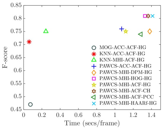 For the Static foreground detection stage, we have included the most common approach employing two background models (DBM) [] and the recent extension to three models (TBM) []. Moreover, we also have integrated the foreground accumulation approach (ACC) []. For sub-sampling approaches, we have included the temporal multiplication of foreground masks (SUB) []. The last included approach is multi-feature combination based on the history images of three features (foreground, motion, and structural information) (MHI) []. Note that we do not include any tracking-based approach, as they are better suited for low-density scenarios and have been clearly outperformed, according to published results [].