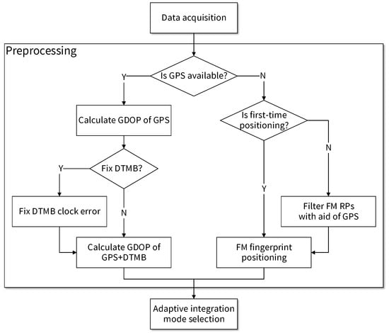 Software processing is made up of preprocessing, adaptive mode selection and information fusion. Flow chart of the preprocessing part is shown in Figure 2. First, whether GPS positioning result is available is checked by the number of visible satellites. If it is available, the geometric dilution of precision (GDOP) of GPS positioning is calculated and whether we can use GPS to correct clock error of DTMB is checked. Then, if the correction is permitted, it is conducted and GDOP of GPS + DTMB positioning is calculated as input variable for mode selection part. If the number of visible satellites is too few for us to get reliable GPS positioning results, FM fingerprint positioning if performed. If GPS positioning had been performed before, we can exploit previous GPS positioning results to attain an estimation of the current user location, and use it to remove FM RPs that are too far away for better accuracy. Errors of DTMB-only or FM-only positioning are often larger than those of GPS only, thus it is necessary to perform DTMB clock error correction and FM RP selection with GPS data for location accuracy improvement. GDOP of GPS alone, GDOP of GPS + DTMB, and RP number within constraint range are needed in the integration mode selection stage.
