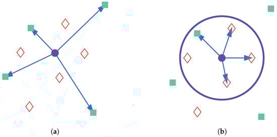 Demonstration of RP constraint: (a) RP selection result without GPS constraint; and (b) RP selection result with GPS constraint. In (a,b), the purple circles are TPs. In (a), cyan rectangles connected with TP by arrows are selected RPs and red diamonds are RPs not selected for computation of TP’s position. In (b), points connected with TP by arrows are selected RPs, the purple circle shows the constraint range.