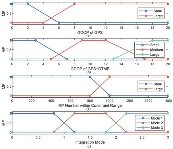 Membership functions in our fuzzy inference system: (a) membership function for GDOP of GPS; (b) membership function for GDOP of GPS + DTMB; (c) membership function for RP number within constraint range; and (d) membership function for system output (integration mode).