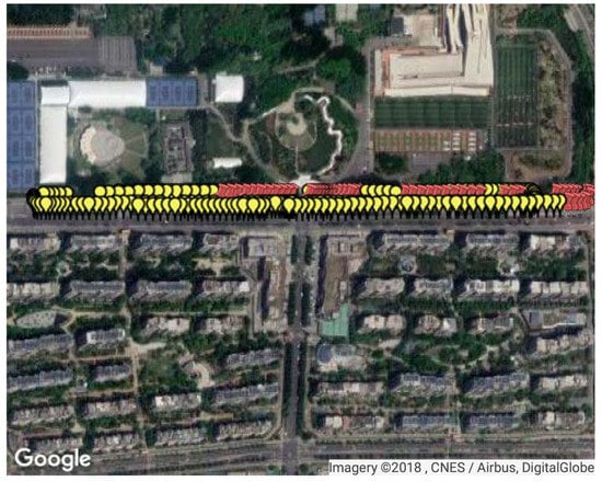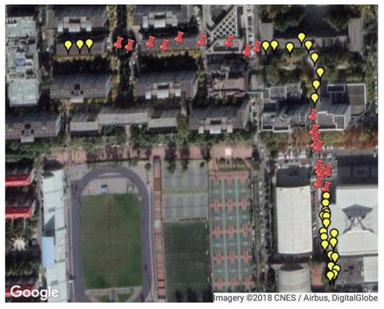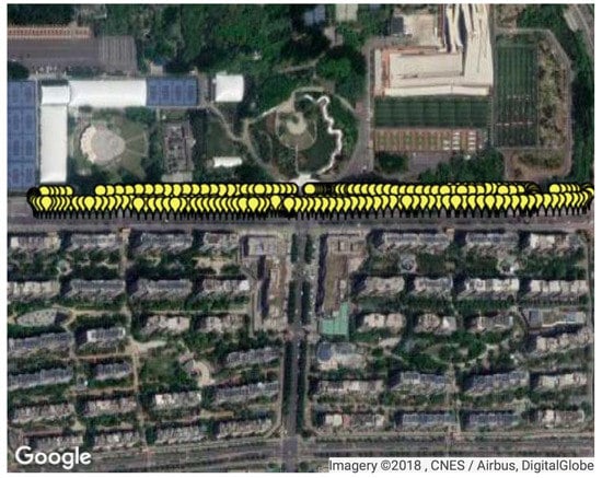 The second test site was on a two-way road, where the single-trip length was around 850 m. Data collection was performed on a car at the frequency of 1 Hz and the total travel distance of test data was 3179.95 m, as shown in Figure 16. FM fingerprint data were collected along the test area. There were 361 test points and 395 reference points at Site 2. In consideration of the density of RPs here, interpolation was not performed at Site 2.