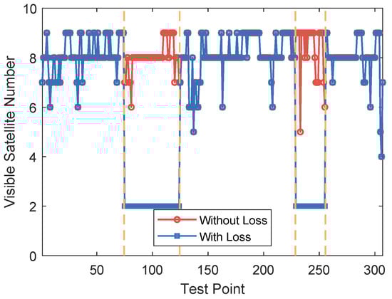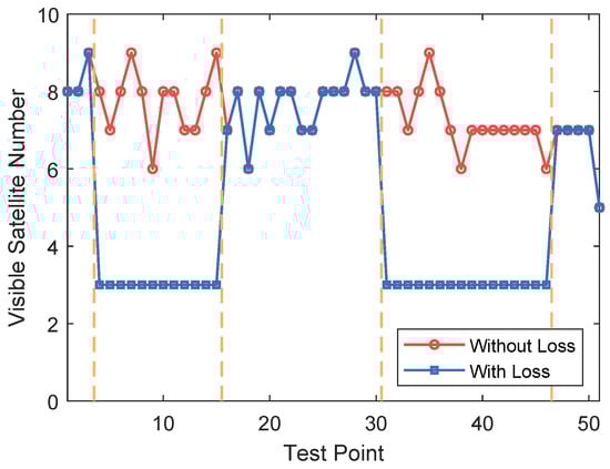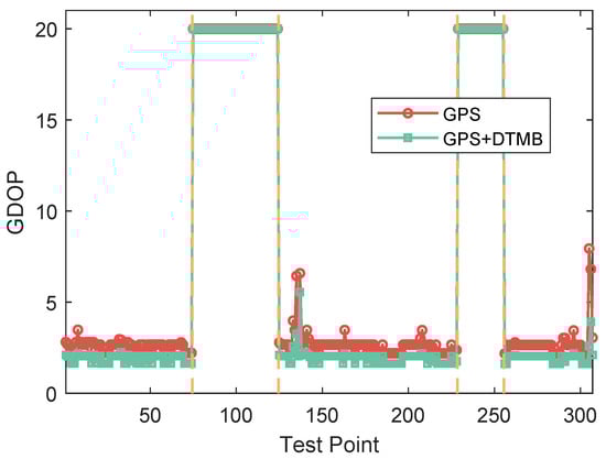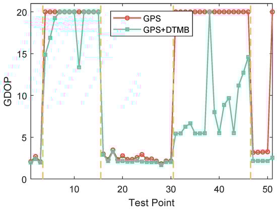 Since the availability of GPS satellites is rather good (no fewer than four satellites available at each TP) at the two test areas, loss of satellite signal was achieved by manually shielding some of the satellites. Two subareas were chosen as area with satellite loss, where available satellite number was restricted to three. For simplification of expression, the 50 TPs were numbered from 1 to 50. TPs numbered from 4 to 15 and from 31 to 46 are test points with satellite loss, as shown in Figure 6. The numbers of available satellites at each point before and after manual shielding are shown in Figure 7. The vertical dashed lines in the figure denote the boundaries between the areas with and without satellite loss. In the figure, we can see that at each point there are at least five satellites available without the satellite loss. The GDOPs of each point under GPS-only and GPS + DTMB mode are illustrated in Figure 8. Here, we manually set GDOP to 20 when it exceeds 20 for convenience in figure plotting. Putting Figure 7 and Figure 8 together, it can be seen that there are at least six available satellites without satellite loss and GDOP of GPS-only mode is no greater than 5. When the number of available satellites is reduced to three, GDOP of GPS-only mode spikes to 20. However, once DTMB was introduced to work together with GPS, GDOP stays below that of GPS-only most of the time, especially in the case of satellite loss. Therefore, it can be concluded that DTMB can improve satellite geometric distribution when the availability of GPS satellites is poor.