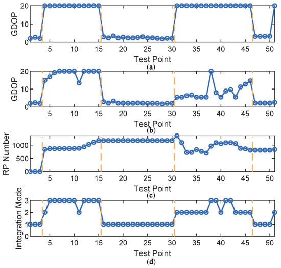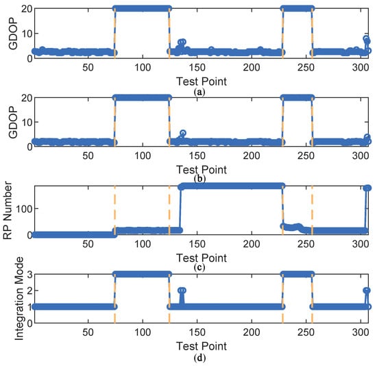 Then, the proposed fuzzy inference system was applied to determine the optimal integration mode at each of the test points. The inputs and output of the fuzzy system are shown in Figure 9. The test points were divided into five sections by the four vertical dashed lines. For points indexed 1, 2 and 3 in the first section, GPS-only positioning error stayed low with sufficient available satellites, leading to choice of the GPS-only mode. In the second section, the GPS-only mode was no longer chosen because GDOP of GPS-only mode increased due to satellite loss. At this time, GDOP of GPS + DTMB varied with time. When GDOP of GPS + DTMB is relatively small, this mode is preferred. However, if it is too large, FM will be introduced to assist them, which is the GPS + DTMB + FM mode. In the third section, available satellite number became adequate again and GPS-only mode was chosen. In the fourth section, GDOP of GPS + DTMB was relatively small most of the time, resulting in the choice of the GPS + DTMB mode. Under some circumstances where GDOP of GPS + DTMB is not small enough and RP number within constraint range is sufficient, the GPS + DTMB + FM mode can yield more precise positioning results. In the last section, GPS-only mode was selected when there was enough available satellites. In other cases, where GDOP of GPS is too large, the GPS + DTMB mode is favored as GDOP is limited to a small level with the help of DTMB.