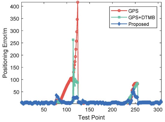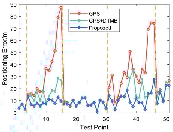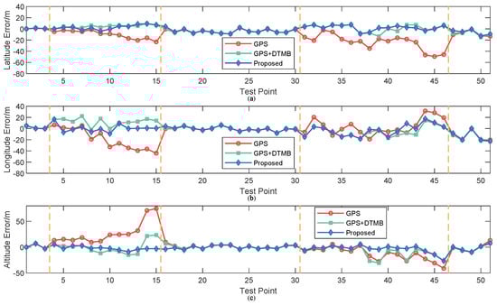 To show the performance of the proposed approach, positioning error of the proposed method was compared with that of GPS and GPS + DTMB. Positioning error of each test point is shown in Figure 10, where it is demonstrated that overall positioning accuracy of the proposed method outperformws the other two, and the incorporation of DTMB reduced positioning error of GPS. Errors of the three methods in latitude/longitude/altitude direction are also provided (Figure 11), where we found that the proposed method outperformed the other two in the three directions most of the time. Then, the true positions of the test points were connected as a virtual trajectory and compared with the trajectories connected by positioning results, as shown in Figure 12. The total travel distance of the trajectory at this site was 828.66 m. The plane location error was small with good GPS availability and increased when confronted with satellite loss. At most points, the plane location error of the proposed method was smaller than that of the GPS-only and the GPS + DTMB method, which is consistent with the results in Figure 11.