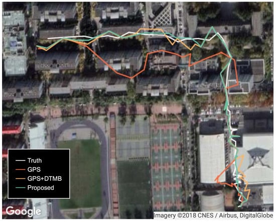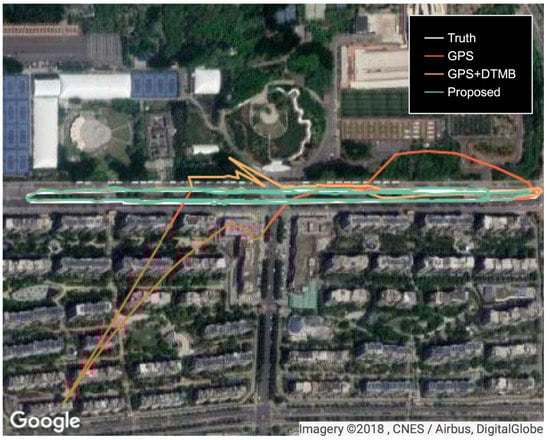 Digital Terrestrial Multimedia Broadcasting (DTMB) is the standard for digital television broadcasting systems in China []. At the headers of DTMB signal frames are pseudo-noise sequences, which act as guard intervals and basis of temporal synchronization. By frame synchronization [,,], we can know the signal propagation duration and the distance between user and transmitter []. Reference time used by DTMB transmitters is strictly synchronized with GPS time. Thus, it is possible to locate users with the trilateration approach when signals from four or more DTMB transmitters are available []. In some regions, it might be difficult to receive signals from more than three DTMB transmitters simultaneously due to transmitter planning reasons. In this case, navigation information from DTMB and GPS, like pseudo-range and pseudo-range rate, can be fused to provide more accurate user positions than either alone [,,]. Signal strength of DTMB signal is usually much stronger than that of GPS signal since the former is broadcasted by fixed ground stations. Thanks to its low frequency of 470–860 MHz, DTMB signal shows stronger penetration and propagation ability than many other signals with higher frequency. Its high availability can also be employed to perform fingerprint positioning [].