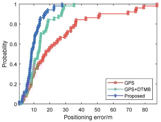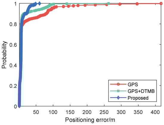 Empirical CDF curves of GPS-only, GPS + DTMB and the proposed method at Site 2.