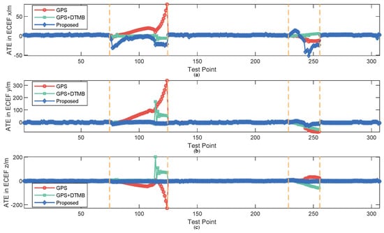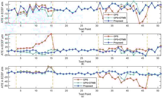ATE of the three methods at each test point at Site 2: (a) ATE in x axis direction of the ECEF system; (b) ATE in y axis direction of the ECEF system; and (c) ATE in z axis direction of the ECEF system.