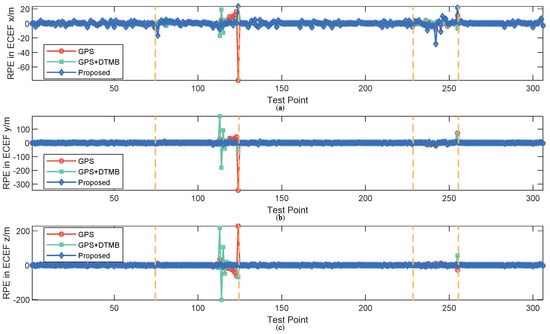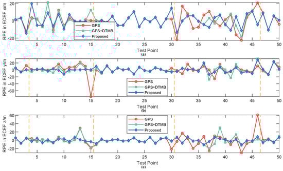 RPE of the three methods at each test point at Site 2: (a) RPE in x axis direction of the ECEF system; (b) RPE in y axis direction of the ECEF system; and (c) RPE in z axis direction of the ECEF system.