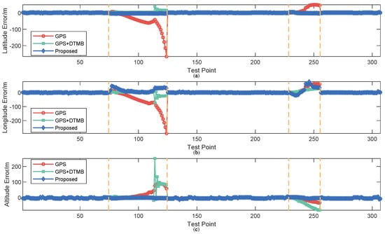 Positioning error of each point in latitude/longitude/altitude direction. (a) error in latitude direction; (b) error in longitude direction; and (c) error in altitude direction.