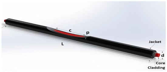 Polymer optical fiber (POF) curvature sensor with the sensitive zone. The optic fiber length is given by L and the optic fiber diameter is d. The sensitive zone length is represented by c and the depth of the cut in the fiber core is p.