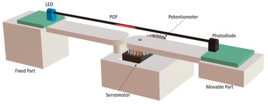 The experiment test bench was made by positioning the POF sensor in a prototype, as shown in Figure 2, which has a servomotor with position control, responsible for dynamic bending. The POF response was compared with the potentiometer response.