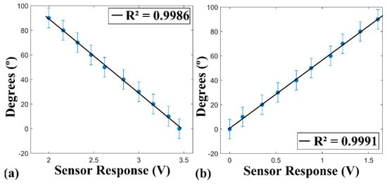 It was observed that the POF sensor obtains a coefficient of determination (R2) of 0.9986, showing the linearity of the sensor in angles between the 0° and 90°. Similar results were found in Reference [20], which realized quasi-static tests in a test bench as well, with the same angles interval and which obtained a R2 of 0.9980 and in Reference [14], which achieved a R2 of 0.9917 in similar tests. The experiments made in References [15,21] showed a linearity of the POF sensor response in statics tests. This demonstrates that the purpose sensor obtains results compatible with the literature. The potentiometer utilized also presented a high coefficient of determination, 0.9991, following a linear standard, as expected.