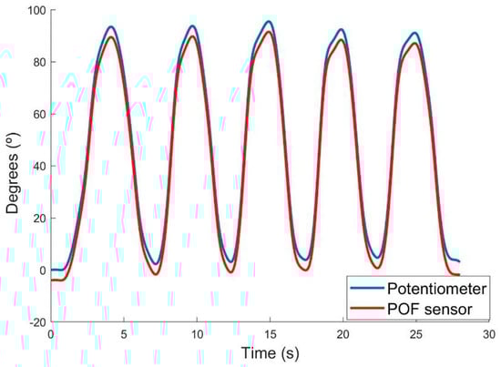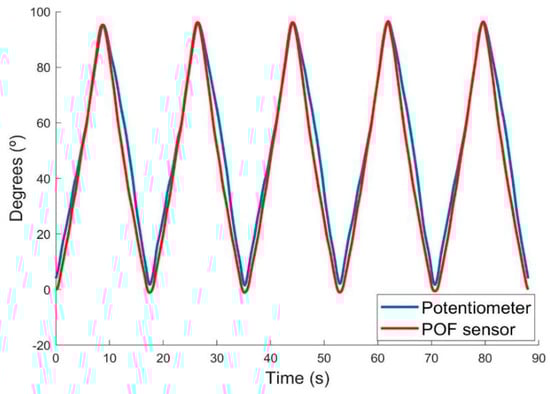 Results of the joint angle measurement for one participant. The blue line represents the potentiometer response and the red one represents the POF sensor response, in degrees.
