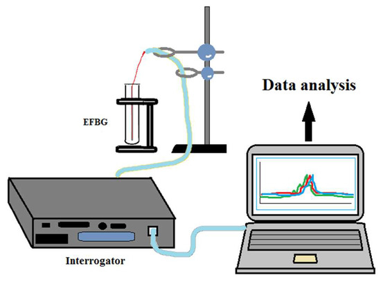 The EFBG biosensor was characterized according to the schematic shown in Figure 3. The etching process was performed by immersing the FBG in a solution of HF at 48%, maintained at room temperature in a fume hood. The biosensor was fabricated using this etching process, applied over ~27 min. The cladding diameter was reduced progressively during etching, where the sensitivity started to appear.