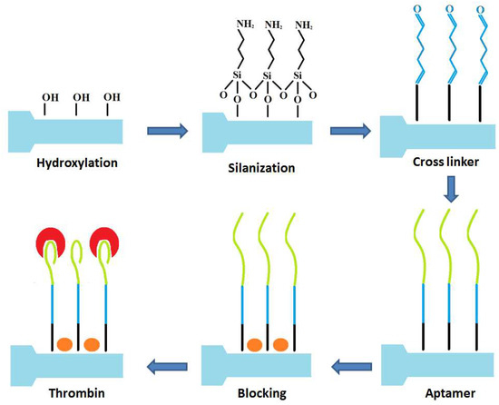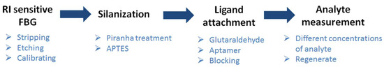 The process for functionalization of the EFBG into a thrombin biosensor is sketched in Figure 2. The etched FBG was treated with Piranha solution (3:1 v/v H2SO4:H2O2) to clean the surface and make it more hydrophilic in nature for further functionalization. It was further silanized with 1% APTES in ethanol (absolute) for 30 min and rinsed with ethanol. The sensors were then heat treated at 110 °C for 30 min and incubated in 25% glutaraldehyde in PBS for 1 h [38] and washed in water [39]. Following this, the sensor was treated with aminated thrombin aptamers for 4 h. Unbound aptamers were washed away with 0.2% sodium dodecyl sulfate in PBS. To reduce non-specific binding, the surface was blocked with 1% bovine serum albumin (in PBS) for 30 min. The thrombin protein in different concentrations (10, 20, 40, 80 nM in affinity buffer) was incubated with sensors for 2 h in each test.