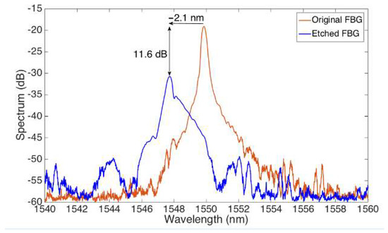 Figure 4 shows the change in the optical spectrum from the original FBG, after the grating has been etched to reach a cladding thickness of approximately 25 μm in diameter. The original FBG has a Bragg wavelength of 1549.98 nm. During the etching process, we observe both a change of wavelength of −2.1 nm, and a reduction of the FBG peak of 11.6 dB, which correspond to the evanescent wave effect of the etched sensor, resulting in this extra attenuation on both the forward and backward waves.