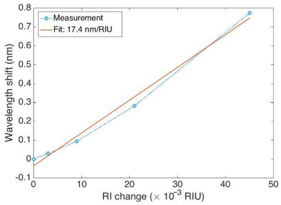 The FBG hereby fabricated has been calibrated for determining the RI sensitivity, using a method previously used in [30] that consists of immersing the grating in solutions of different RI values formed by water/sucrose mixtures (1.6%, 3.1%, 6.3%, 12.5%, 25.0%); the refractive index change is ~1.85 × 10−3 RIU for each 1% of sucrose, for such values of the refractive index. The wavelength shifts towards the longest values when the RI increases, with an estimated sensitivity of 17.4 nm/RIU and a linearity coefficient of 0.993 is obtained, as seen in Figure 5.