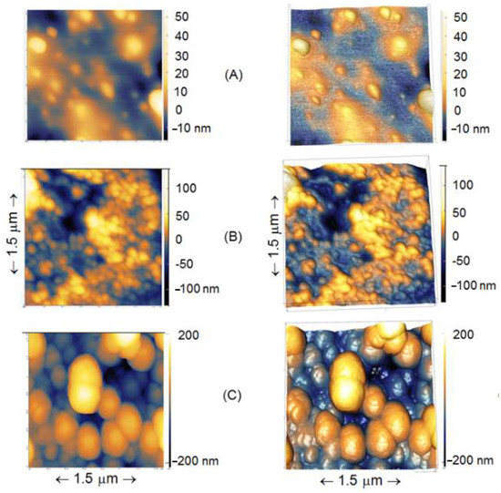 High-resolution topographical characterization of the surfaces was carried out using Atomic Force Microscopy (AFM) SmartSPM 1000 (AIST-NT Inc., Novato, CA, USA) in AC-Mode (non-contact mode) of AFM scanning. All the AFM measurements were performed with a scan range of 1500 nm in X-Y and height Z was set automatically, with a scanning rate 0.2 Hz. AFM images were obtained using a super sharp type “NSG30_SS” cantilever, with a tip radius curvature of up to 5 nm, force constant of 22–100 N/m, and resonance frequency of 200–440 kHz in air (Tips Nano).