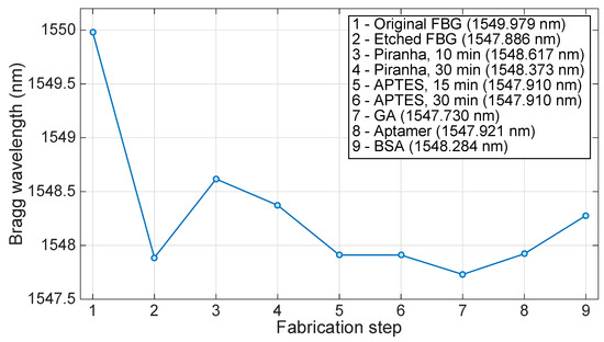 Change of Bragg wavelength through the fabrication and functionalization of the EFBG to thrombin sensing. The chart shows the estimated Bragg wavelength after each fabrication step that precedes the thrombin detection. In the figure, key GA stands for glutaraldehyde, while BSA stands for bovine serum albumin.