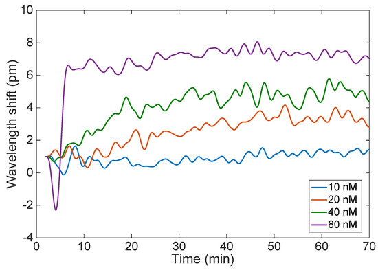 Wavelength shift observed for 70 min detection of thrombin for the EFBG, measured at different concentrations of thrombin ranging from 10 nM to 80 nM.