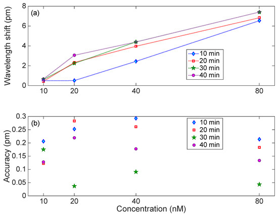 The results of Figure 8 have been further analyzed, to evaluate the sensor response over time and to evaluate the uncertainty. Bragg wavelength shift (recorded over 1 min) is plotted against thrombin concentrations (Figure 9a). At the lowest measured concentration of thrombin (10 nM), it is difficult to distinguish how the wavelength shift changes with time; this is better for higher concentrations of thrombin. Accuracy was estimated as the standard deviation of the Bragg wavelength change recorded over one minute at constant thrombin concentrations (Figure 9b). It can be clearly seen that as time passes, the accuracy of the measurement is improved. For most measurements, the Bragg wavelength deviation stays within 0.05 to 0.3 pm, which is the same value estimated for the Bragg wavelength detection on the interrogator (0.2 pm).