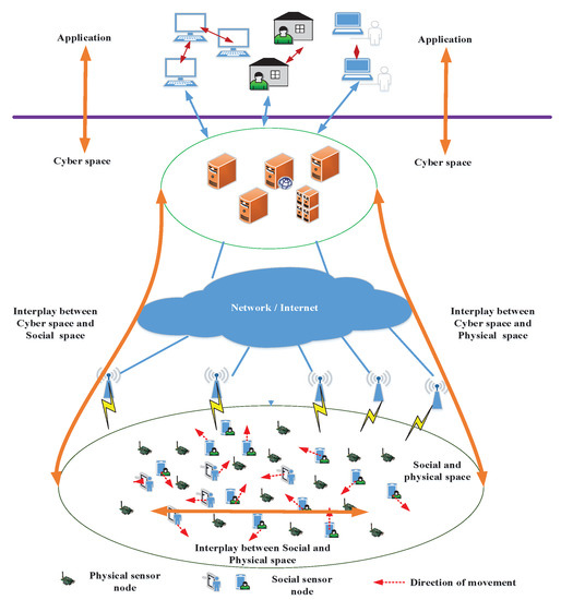 In recent years, cyber-physical-social system (CPSS) attracts a great amount of attention because it considers the integration of the human activity with CPS or IoT. Many applications based on CPSS have been developed, such as intelligent transportation [2] and smart city [3]. The corresponding architecture, methodology, control, and command schemes are also proposed [1,4,5]. In particular, the sensing network architecture based on WSN as an important part of CPSS plays a significant role for sensing, transmitting and collecting information. Since the WSN architecture composed of social and physical sensor nodes is significantly different from that of traditional WSN, the related research works on traditional WSN are not applicable for CPSS due to the characteristics of dynamic social mobility for social sensors. Therefore, some novel methods are proposed to solve the emerging problems in CPSS. For example, a moving centroid based routing protocol is presented to deal with the incompletely predictable cyber devices in cyber-physical-social distributed systems [6]. In [7], the authors studied a fusion scheme of cellular network and wireless sensor for CPSS. To prolong the lifetime of the IoT, a novel rendezvous data routing scheme based on lower sensors is proposed to achieve the data transmission for scalable CPS networking infrastructure [8]. In addition, a new sensor trajectory planning method is proposed to solve the trajectory planning problem for robotic CPSS [9]. However, all the above-mentioned methods have not considered the improvement of transmission efficiency of the novel WSN in CPSS. In [24], the authors presented a framework and infrastructure of collaborative CPS to improve the management efficiency of the increasing number of devices. The importance of collaboration among components is considered.