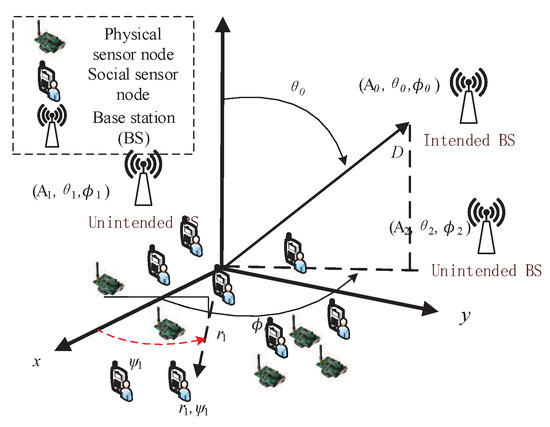 We consider a CPSS with a social or physical sensing WSN with M nodes, in which there are O social sensor nodes and F physical sensor nodes randomly deployed on a plane, as shown in Figure 2. We assume D base stations (BSs) are located in the surrounding area of the WSN. We use and to denote the BSs and the sensor nodes, respectively. The nodes are referred to as the social sensor nodes. The other nodes denote the physical sensor nodes. The transmission range of each sensor node cannot fully cover the BS due to the limited transmission power. As a result, the sensor nodes need to use CB technique to transmit the monitoring information to the intended BS. Moreover, the polar coordinates and are used to denote the location of the collaborative node and BS, respectively. We use to denote the Euclidean distance between the kth node and location . The elevation angle lies in the range from 0 to and the corresponding azimuth angle is is from to . According to the literature [11], we first present the value of as follows