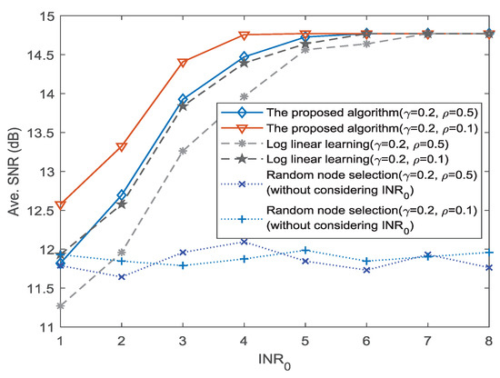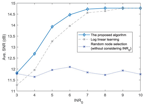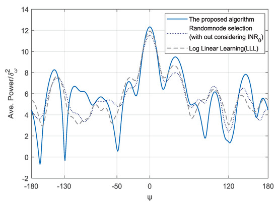 To further analyze the performance, we compare the proposed algorithm with log linear learning (LLL) method [29] and the random node selection algorithm [22]. The LLL is often used to optimize the game theoretical problem [30,31]. The method focuses on the updating of the action selection probability based on the received utility. The random node selection is to choose L nodes to meet the requirement of transmission gain in the direction of intended BS or low interference power for the directions of the unintended BSs. The comparison result of average beampattern performance is shown in Figure 4. It can be observed that, when the is set as 4, the result indicates that the INR at the three unintended BSs of the proposed algorithm is much lower than that of the log-linear learning method and the random node selection algorithm. In addition, the SNR of the mainlobe of our proposed algorithm at the direction of the intended BS is much higher than that of the other algorithms. This is because the proposed algorithm considers the utility of all different position for all previous time slots based on regret matching. For the LLL method, the utilities of different actions are calculated and then the action selection probability is updated based on the current utility. Since the location of social sensor node is dynamic, the LLL method can hardly capture such location change.