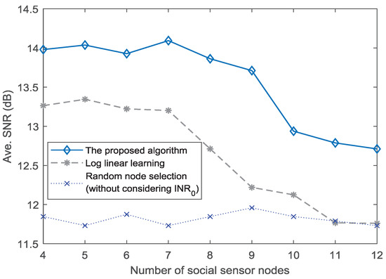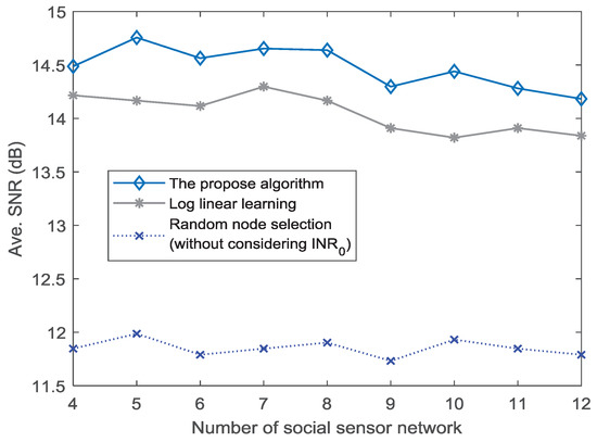 The above analysis mainly focuses on a fixed number of social and physical sensor nodes. To further analyze the performance with respect to different number of social sensor nodes, we consider 4–12 social sensor nodes. Then, the SNR performance under dB is presented in Figure 6. The SNR performance of the proposed algorithm and LLL method decreases with the number of social sensor nodes. Specifically, when the number of social sensor nodes is greater than 9, the SNR amplitude reduces significantly for the proposed algorithm. Similarly, this situation also happens in LLL method. It shows that, although some social sensor nodes integrated into physical sensor nodes have positive role for the CB transmission in CPSS, excessive social sensor nodes have a negative impact on the transmission of CB. The reason is because the movements of excessive social sensor nodes can hardly meet the condition of . When the is set as 7 dB, the impact on the transmission of CB is weakened. As shown in Figure 7, the SNR performance reduces slowly with the number of social sensor nodes. It is evident in Figure 6 and Figure 7 that the number of social sensor nodes has an impact on the CB transmission. However, as the value of increases, the impact is weakened gradually.