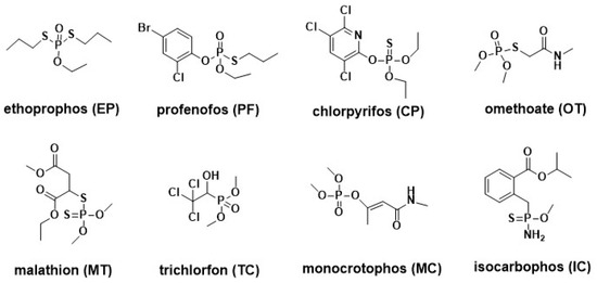 Pesticides have been widely used worldwide to protect crops from insects and increase the quantity and quality of agricultural products [1,2,3]. Pesticide use, however, can affect ecosystems, nontarget organisms, agricultural product safety, and human health [4]. Organophosphates (OPs) are a class of pesticides designed to affect the insect nervous system [5,6,7,8,9,10]. OPs irreversibly inactivate acetylcholinesterase, an enzyme that degrades the neurotransmitter acetylcholine at cholinergic synapses and that is essential to nerve function [11,12]. OP residues in agricultural products and water are a potential source of toxicity to bees, wildlife, and humans [13,14]. It is therefore imperative to develop highly sensitive and reliable methods to determine pesticide content in environmental samples.
