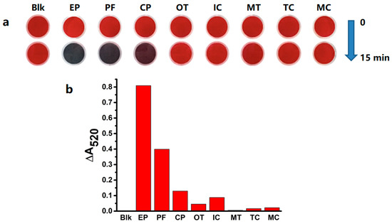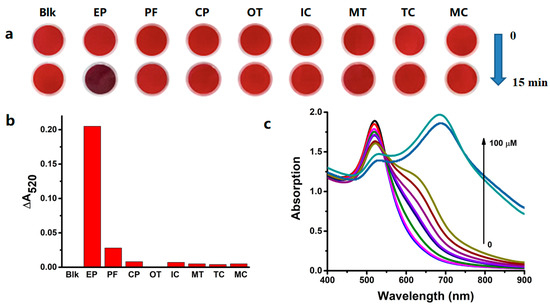 We first analyzed the aggregation-inducing effect of the OPs (Figure 1) on citrate-capped AuNPs (Figure 2a). We calculated the absorption change at 520 nm (ΔA520) by setting the blank value as zero. The corresponding LOD was also adjusted by deducting the blank value. We found that ethoprophos, profenofos, and chlorpyrifos induced aggregation of citrate-capped AuNPs. This was confirmed by the AuNPs’ color changes from red to purple and blue. The ΔA520 was 0.809 (ethoprophos, 10.0 μM), 0.399 (profenofos, 10.0 μM), and 0.129 (chlorpyrifos, 10.0 μM). The AuNP solutions did not change color in the presence of the other pesticides (1.0 mM) or ethanol. The ΔA520 for malathion could not be determined. The ΔA520 values of trichlorfon, omethoate, monocrotophos, isocarbophos, and malathion were determined to be much smaller than those of ethoprophos and profenofos (Figure 2). These findings indicated that although a visible aggregation of citrate-capped AuNPs was not observed, these four pesticides could cause a slight aggregation of citrate-capped AuNPs.