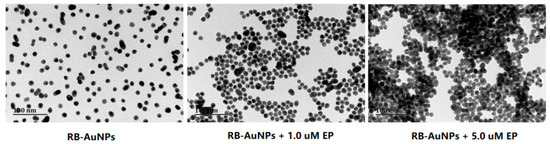 TEM images of RB-AuNPs (3.0 nM) added with various amount of ethoprophos. The scale bar is 100.0 nm.