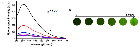 (a) The variation of fluorescence intensity and (b) fluorescence imaging of RB-AuNPs (3.0 nM) added with various amounts of ethoprophos (EP) (0–5.0 µM).