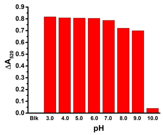 Usually, pH shows a great effect on AuNP-based colorimetric sensors. The pH effect on this assay was studied in detail. Figure 6 reveals the ΔA520 of RB-AuNPs with 10.0 μM ethoprophos at various pH values (from 3.0 to 10.0). The ΔA520 of RB-AuNPs in the presence of ethoprophos was stable (around 0.8) under acidic and weakly basic conditions. However, it dramatically changed to 0.04 at pH 10.0, probably due to the decomposition of ethoprophos under basic conditions. These results suggest that this assay is practical and applicable under broad pH conditions.