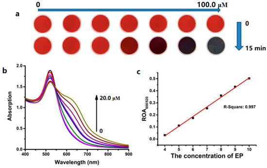 (a) The colorimetric and (b) absorption changes of RB-AuNPs in various amounts of ethoprophos. (c) The linear fitting of ROA600/520 based on RB-AuNPs in the range of 4.0–10.0 μM ethoprophos.