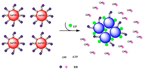 We found that after modification of the AuNPs with ATP, OP-induced aggregation of the NPs was inhibited to some extent. In the first experiment, using citrate-capped AuNPs, the OPs ethoprophos, profenofos, and chlorpyrifos caused notable aggregation of AuNPs, visualized by the color change from wine-red to dark blue after 15 min. Added ATP, however, replaced citric acid as the stabilizing agent, as ATP has a greater affinity to AuNPs [37,38,39]. RB-AuNPs were not induced to aggregate by profenofos or chlorpyrifos, but only by ethoprophos. The corresponding ΔA520 change in ultraviolet-visible light absorption declined markedly from 0.809 to 0.205, indicating that ATP enhanced AuNPs’ stability and reduced the tendency to aggregate. Citrate-capped AuNPs had slight absorption responses to the other pesticides, whereas RB-AuNPs were not responsive. These findings suggest that ATP is protective of AuNPs and reduces OP-induced aggregation.