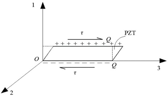 Piezoelectric transducers are made using the direct piezoelectric effect. The direct piezoelectric effect describes how a piezoelectric material deforms when a stress is applied along a certain direction of the piezoelectric material. The two surfaces of the piezoelectric material generate charges of equal magnitude but opposite signs, which convert mechanical energy to electrical energy. Xu et al. [8] used d15-type shear piezoelectric ceramics to create a dynamic shear stress sensor using the direct piezoelectric effect. Figure 1 shows the direct piezoelectric effect of a shear piezoelectric ceramic, where τ is the shear stress of the shear piezoelectric ceramic, 3-3 is the polarization direction, and the plane perpendicular to the 1-1 axis is the electrode coverage.