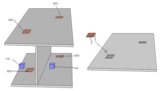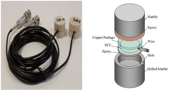 Piezoelectric transducers can be externally bonded on the surface of a structure, or internally embedded in the structure to achieve structural health monitoring (SHM). The embedded piezoelectric transducers are fabricated by sandwiching a waterproofed lead zirconate titanate (PZT) patch with electric wires between two protective layers, which can be used as an actuator to generate a stress wave or a sensor to sense a stress wave. Smart aggregates (SAs) formed by piezoelectric patches and waterproof lead embedded in concrete blocks are a type of embedded piezoelectric transducer, as shown in Figure 2 [9]. PZT transducers can also be coupled to the surfaces of structures in ultrasonic experiments to receive stress waves and monitor the health status of those structures.