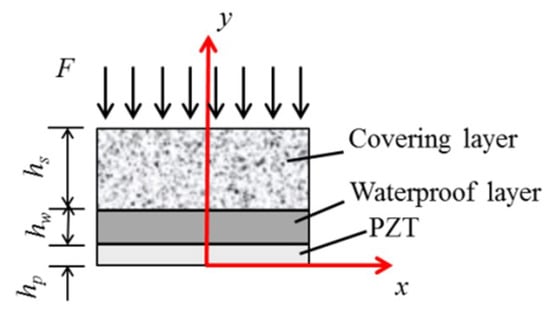 The function of the waterproof layer is to provide electrical protection for the PZT patches, while the protection layer provides mechanical protection for the PZT patch. This type of embedded PZT transducer tends to use the d33 mode—the compression mode—to measure stress and to obtain stress waves in the polarization direction of d33. The vibration mode of the PZT transducer is expressed as