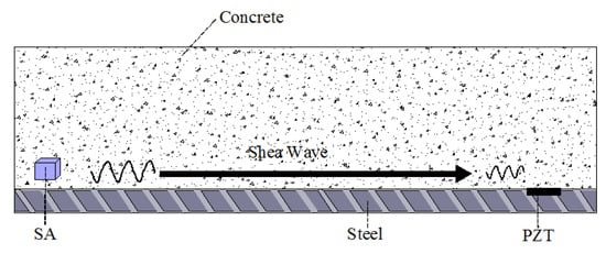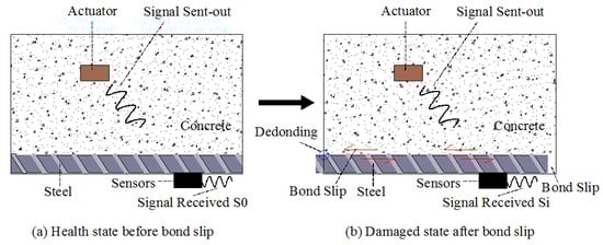FRP is a composite material with high corrosion resistance and a high strength-to-weight ratio. This material was used increasingly in reinforced concrete structures [102]; thus, it was also used in bridge structures. The effectiveness of a structure depends on the bond between FRP composites and concrete structures. Therefore, the detection of debonding between FRP materials and bearing concrete structures is very important for ensuring the safety of bridge structures. Jiang et al. [103] proposed an active sensing method based on stress waves to monitor the debonding process of FRP tendons carrying concrete structures. Qin et al. [104] developed an active sensing method, as shown in Figure 8, using piezoceramic sensors to monitor the development of bond slip between steel and concrete.