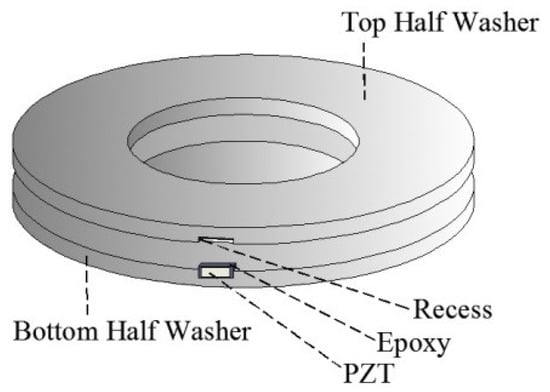 Because tangential damping has an important influence on wave propagation through the energy dissipation of bolted connections, different degrees of pre-loading are needed. Based on fractal contact theory, Wang et al. [96], considering the energy dissipation of the tangential damping of a bolt connection under the pre-tightening force of different bolts, took into account the effect of an incomplete interface and directly realized accurate quantitative monitoring. For bolt looseness monitoring, Huo et al. [97] also proposed a “smart washer” (as shown in Figure 7), manufactured by embedding a piezoelectric ceramic patch into two prefabricated flat metal rings and using it as a sensor to detect the loosening of bolt connections. It is possible to establish the relationship between the degree of any pre-loading degradation of bolt connections and the response signal of the stress wave propagating between the two washers. In addition, the pre-load loosening index based on the wavelet energy ratio is used to reflect the pre-load loss of bolts.